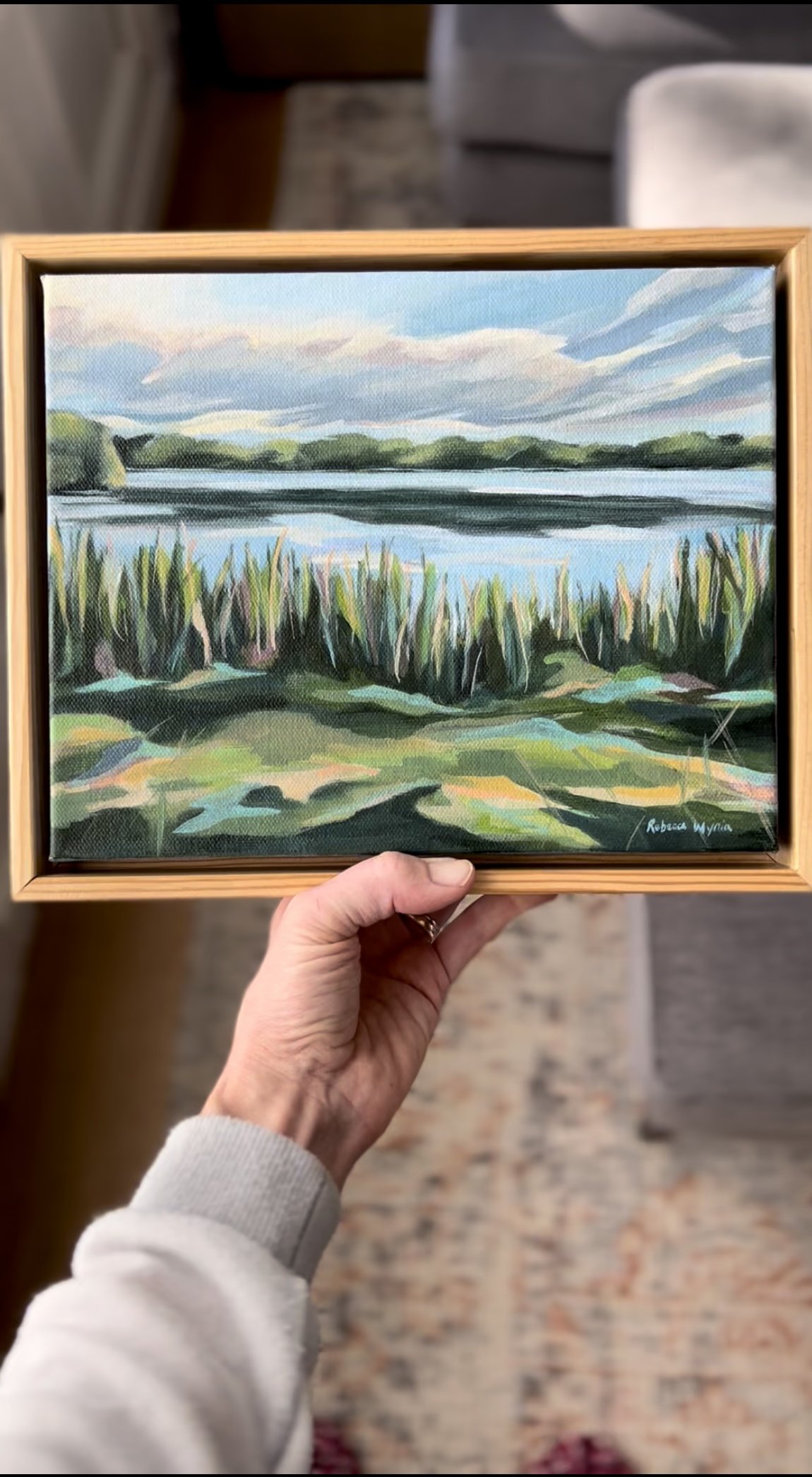 Original 8”x10” acrylic painting on 1.5” gallery profile stretched canvas mounted in a floater frame with a natural wood stain. Please note that colors in real life may vary slightly depending on the screen you’re using as well as the lighting of the photography. Items are available for free local pick up or shipping for a flat fee to anywhere in the continental USA. Please inquire for international shipping prior to purchase.